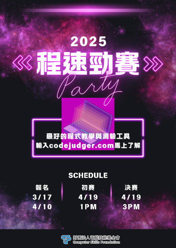 一、本會為培養選手們在程式競賽過程中將課堂知識實際應用,並以創新方式應對各種題目挑戰。透過競賽,激發同學對學習程式的熱情。特舉辦旨揭活動,詳細內容如附件說明。 公文連結:公文 實施計畫連結:實施計畫 活動海報連結:活動海報 活動簡報連結:活動簡報 |