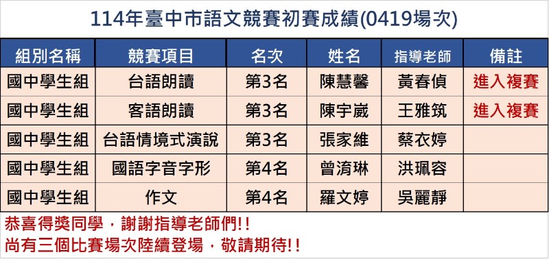 恭賀!本校學生參加114年度臺中市語文競賽初賽(4/19場次)榮獲佳績