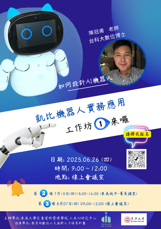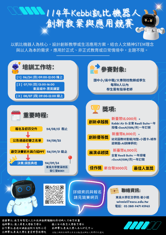 一、依據國立臺北教育大學114年4月25日北教大教育字第1140610044號函辦理。 二、為促進跨領域合作,增進教育與科技創新,東吳大學巨量資料管理學院特辦理旨揭競賽,鼓勵各級學校教師與學生參與,展現創新設計與實踐能力。 三、競賽主題及目標:以「凱比機器人」為核心,設計創新教學或生活應用方案,結合人文精神、STEM理念與以人為本的需求,應用於正式、非正式教育或日常情境中,創造更具實用性的教育與科技融合方案。 四、參賽組別及對象如下: (一)大專跨域組:此組別需跨系所組隊,教師或學生皆可參賽,每隊至多8人,學生需有指導老師。 (二)一般教案組:此組別可包含國中小、高中職、大專院校及職業機構教師或學生,每隊至多8人,學生需有指導老師。 五、參賽注意事項: (一)參賽作品需提交符合創用CC授權標準。 (二)所有參賽作品不得侵犯他人著作權,若發生侵權情形,參賽者需負全責。 (三)參賽作品的著作權歸屬於參賽團隊,但需無償提供主辦單位進行宣傳與展示使用。 六、競賽與工作坊時程如下: (一)凱比機器人工作坊: 1、線上工作坊1:114年6月26日(星期四),報名網址為https://reurl.cc/Dqmo7Q。 2、實體工作坊2:114年7月10日(星期四),報名網址為https://reurl.cc/Dqmb0R。 3、線上工作坊3:114年8月7日(星期四),報名網址為https://reurl.cc/o80mv5。 (二)競賽時程: 1、報名及初賽交件:即日起至114年8月15日(星期五)。 2、公告通過初審之名單:114年8月25日(星期一)。 3、繳交決賽影片與介紹簡報檔:114年9月21日(星期日)。 4、決賽暨頒獎典禮:114年9月24日(星期三),地點:東吳大學雙溪校區普仁堂R0101。 七、獎狀與獎金如下: (一)「創新卓越獎」(1名):新臺幣15,000元+Kebbi Air S+全套RaaS Suite一年授權+GenAI(10M/月)一年訂閱。 (二)「創新優等獎」(1名):新臺幣8,000元+幼兒園教材套組(地墊+小圖卡+城市遊樂園+AI訓練學校)。 (三)「展演卓越獎」(1名):新臺幣6,000元+全套 RaaS Suite 一年授權+ GenAI(10M/月) 一年訂閱。 (四)佳作(3名):新臺幣3,000元。 (五)最佳人氣獎(1名)。 (六)詳細資訊,請參閱附件。 八、競賽報名網址:https://reurl.cc/7KRMzy。 九、如有疑問,請洽詢東吳大學巨量資料管理學院崔小姐,電子郵件:winnie17@scu.edu.tw;電話:(02)2881-9471分機5965。 十、檢附「STEM人文跨域與AI應用競賽—114年Kebbi凱比機器人創新教案與應用競賽」競賽辦法及海報如附件。