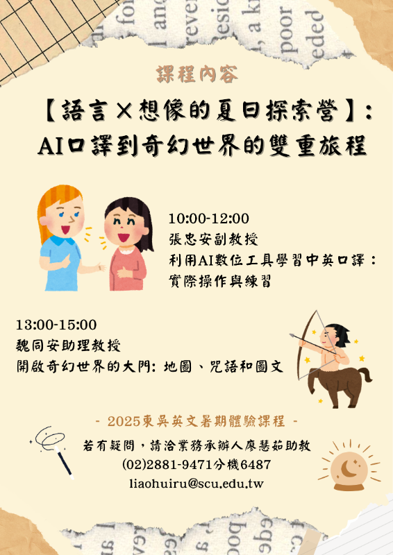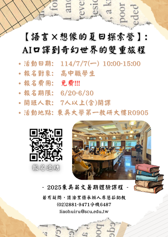 轉知東吳大學英文學系舉辦「語言×想像的夏日探索營——從AI口譯到奇幻世界的雙重旅程」暑期體驗課程,鼓勵學生報名參加。