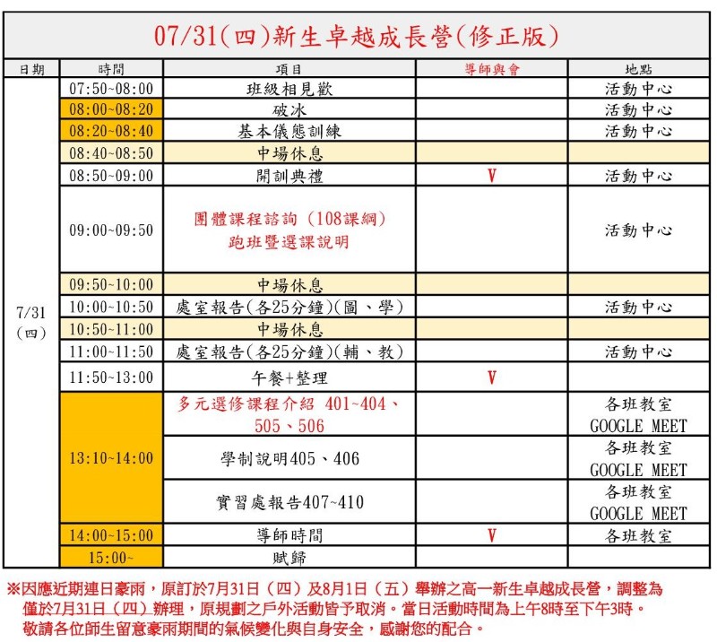 ※因應近期連日豪雨,原訂於7月31日(四)及8月1日(五)舉辦之高一新生卓越成長營,調整為僅於7月31日(四)辦理,原規劃之戶外活動皆予取消。當日活動時間為上午8時至下午3時。敬請各位師生留意豪雨期間的氣候變化與自身安全,感謝您的配合。