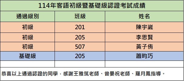 恭賀本校學生參加114年客語認證3人通過初級、1人通過基礎級