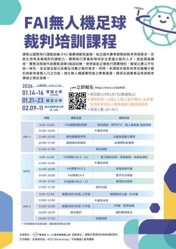 一、課程主旨在培育校園種子裁判與教育推廣人力之功能,強化無人機競賽制度之專業基礎,確保全國賽事品質與教育價值之穩定發展。 二、課程資訊: (一)課程日期:115年1月14日至2月11日期間共三梯次(詳見課程海報)。 (二)課程地點:實踐大學台北校區(北區)、靜宜大學(中區)、國立高雄科技大學第一校區(南區)。 (三)課程人數:每梯次上限30人(即日起至115年1月7日,額滿為止)。 (四)課程對象: 16歲以上國人皆可報名,主辦單位得針對受訓人員資格進行審查與排序 (五)課程方式:實體面授。 (六)報名網址:https://reurl.cc/0ak4GK。 (七)注意事項 1、全程活動免費(含餐點),全程參與並通過測驗者於課程結束後授予研習證書。 (1)完成培訓之學員有義務擔任2026年北、中、南分區競賽之裁判至少2場(除學員本人所在地以外之區域)。 2、承辦單位有調整日期或更換行程之權利, 三、請惠予貴校參加人員得憑本公文請公差假,若有學校授課教學因素,請協助課務排代。 四、活動聯絡人 (一)教育部無人機教育推廣辦公室 連曼筑,電話:07-6011000轉31493,電子郵件:nadinelian@nkust.edu.tw。