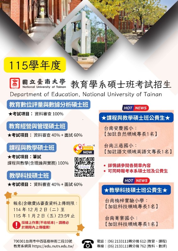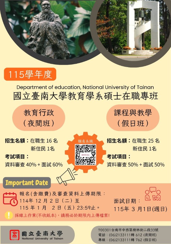 國立宜蘭大學 主旨:檢送本校應用經濟與管理學系研究所碩士班招生資訊,敬請惠予公告教職員周知,供在職進修參考,請查照。 說明: 一、為提供各級學校教職員多元且具實務導向之進修管道,本校應用經濟與管理學系設有研究所碩士班,包含「應用經濟學碩士班」及「經營管理碩士班」,特函請貴校協助公告相關招生資訊。 二、本系研究所課程規劃兼顧理論基礎與實務應用,涵蓋經濟分析、管理決策、資料分析與政策評估等領域,適合有意提升專業知能、強化行政與管理能力之在職教職員報考進修。 三、敬請貴校協助將本招生資訊公告於校內教職員相關管道(如校內公告系統、教職員信箱或進修資訊平台),以利有需求之教職員參考,至紉公誼。 國立臺中教育大學 主旨:本校高等教育經營管理碩士學位學程「115學年度研究所招生考試」辦理招生,惠請協助公告,並鼓勵貴單位所屬相關人員踴躍報名,請查照。 說明: 一、旨揭研究所招生考試採網路報名,報名時間為114年12月23日(週二)10時起至115年1月14日(週三)24時止(報名網址:https://mdpt.ntcu.edu.tw/recruit/signup/)。 二、本碩士班以培養理論與實務兼具之高等教育經營管理人才,有高等教育社會責任研究、校務研究與管理實務、高等教育課程與教學研究、高等教育評鑑研究、高等教育人力資源管理研究等特色課程,歡迎對教育相關領域有興趣者,或大學行政人員報考。 三、如考取本碩士班,可參加研究生教育學程甄選,通過後可修習國民小學/幼兒園/中等教育學程,未來可擔任國小/幼兒園/國民中學教師。 四、詳細報名方式與相關資訊,請參閱下列網址,下載簡章:https://as.ntcu.edu.tw/front/income/news.php?ID=01e67c40b71b116ef8b3889c29d31b1e&Sn=762 五、相關問題請逕洽國立臺中教育大學高等教育經營管理碩士學位學程04-2218-3289 國立臺南大學 主旨:檢送本校教育學系115學年度碩士班及碩士在職專班入學考試報名資訊 ,懇請協助轉知所屬學校教師,請查照。 說明: 一、報名日期:114年12月2日至115年1月2日23:59止(採網路報名,線上繳交資料)。 二、本系所屬碩士班有: (一) 教育經營與管理碩士班 (二) 課程與教學碩士班 (三) 教學科技碩士班 (四) 教育數位評量與數據分析碩士班 三、本系所屬碩士在職專班有: (一) 課程與教學碩士在職專班(假日班) (二) 教育行政碩士在職專班(夜間班) 四、各班別詳細招生報名訊息請參閱本校招生網頁 https://admissions.nutn.edu.tw/Admissions/ 大葉大學 主旨:檢送本校115學年度研究所碩、博士班考試入學招生資訊,敬請惠予公告周知,並歡迎貴屬學生、教師及同仁踴躍報考,請查照。 說明: 一、報名日期: (一) 碩士班(含碩士在職專班):自115年1月15日(星期四)起至115年3月5日(星期四)止。 (二) 博士班:自115年4月9日(星期四)至115年5月4日(星期一)止。 二、報考方式:採網路報名,網址如下: (一) 碩士班考試入學 http://dyu.edu.tw/su15 (二) 碩士在職專班 http://dyu.edu.tw/su17 (三) 博士班考試入學 http://dyu.edu.tw/su12 三、招生系所、招生名額及相關報考資訊,敬請詳閱招生簡章,歡迎至本校網頁查詢並免費下載。 |