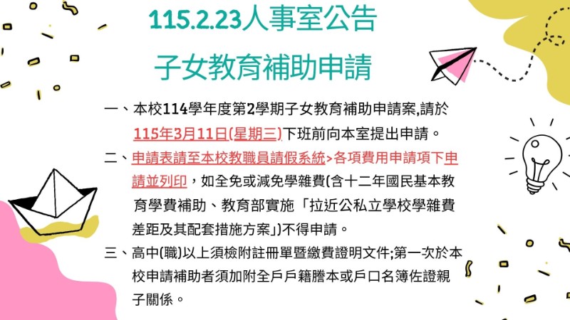 重要通知!!本校114學年度第2學期子女教育補助申請案,請於115年3月11日(星期三)下班前向人事室提出申請