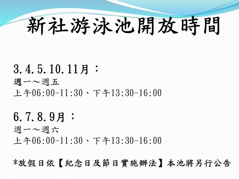上午06:00-11:30、下午13:30-16:00 6.7.8.9月: 週一~週六 上午06:00-11:30、下午13:30-16:00 *放假日依【紀念日及節日實施辦法】本池將另行公告 |