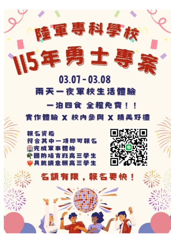 115年勇士專案115年勇士專案開始報告嚕,1泊4食全程免費,2天1夜軍校生活體驗,走過路過千萬不要錯過喔! 報名時間:115年1月2日(星期五)至 2月23日(星期一)止。