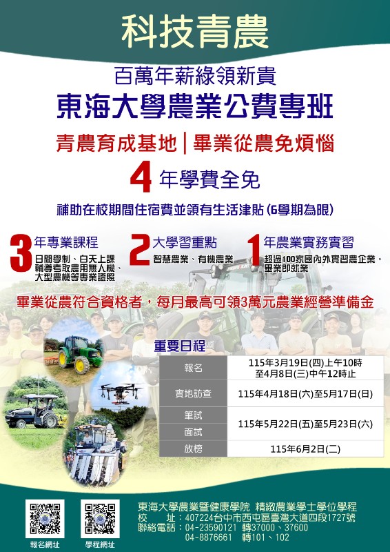 檢送本校「115學年度精緻農業學士學位學程農業公費專班」招生簡章及海報電子檔各1份,請惠予協助轉知所屬學生並鼓勵踴躍報考為荷。 |