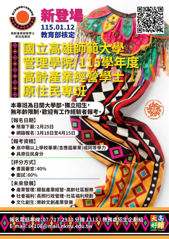 國立高雄師範大學115學年度「高齡產業經營學士原住民專班」招生資訊 |
