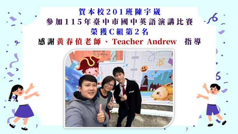 賀本校201班陳宇崴參加115年臺中市國中英語演講比賽獲第2名