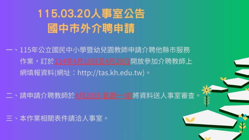 重要通知!!115年公立國民中小學暨幼兒園教師申請介聘介聘他縣市服務作業,訂於115年4月10日至4月20日開放參加教師上網填報資料(網址:http://tas.kh.edu.tw)
