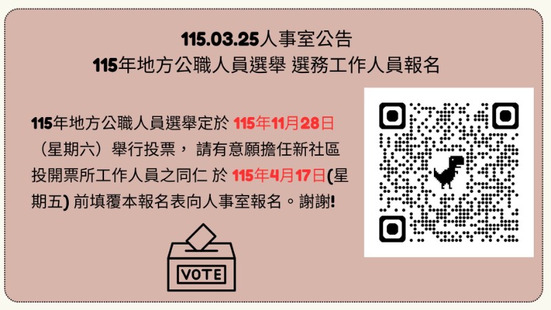 115年地方公職人員選舉定於 115年11月28日(星期六)舉行投票, 請有意願擔任新社區投開票所工作人員之同仁 於 115年4月17日(星期五) 前填覆本報名表向人事室報名。謝謝!