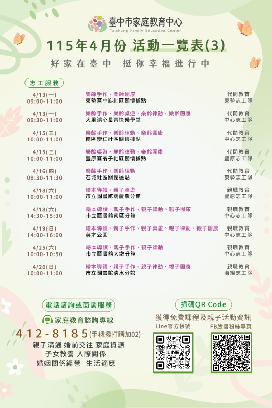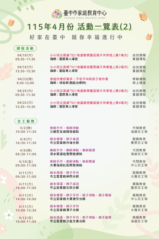臺中市家庭教育中心115年4月份活動一覽表