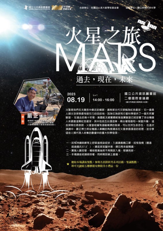 | 標題 | 轉知國立公共資訊圖書館辦理「全民閱讀、終身學習」閱讀講座-「火星之旅—過去,現在,未來」活動資訊 |