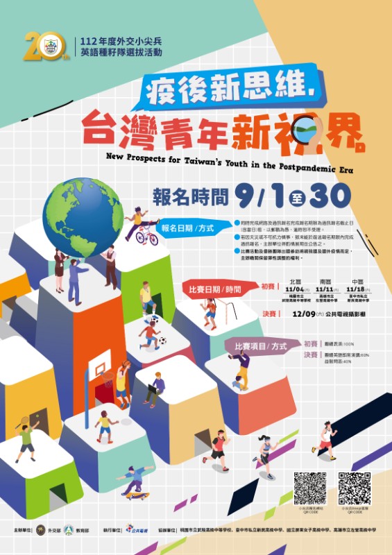 一、為培育國際化人才溝通能力、團隊精神及國際視野,特舉辦本活動,期透過校際間學生互相觀摩及國際間相互交流,深化學生之溝通與探究能力,提升學生對不同文化及價值觀之理解,進而促進國際間之交流與合作、邁向「接軌國際、鏈結全球」之願景。 二、本案活動參賽資格如下: (一) 本案活動參賽資格如下: 全國高級中等學校、五專一至三年級在學學生及各該主管機關許可參與高級中等教育階段非學校型態實驗教育取得學籍及未取得學籍之學生(含機構、團體及個人實驗教育),每隊至多得有1名曾在國外全英語教學學校、國內外僑學校接受小學(含)以上教育之我國籍學生,惟來臺留學學生(以外籍生身分就讀本國者),不得報名參加。 (二) 由各校遴選推薦優秀學生4人組隊報名參加,並以學校為報名單位,不得跨校組隊。 (三) 各該主管機關許可參與高級中等教育階段非學校型態實驗教育取得學籍之學生,由原設籍學校報名參加;非學校型態實驗教育未取得學籍之學生(以下簡稱未取得學籍學生),以同一核定實驗教育計畫單位之直轄市、縣(市)為限,4人組隊,由該直轄市、縣(市)主管機關造具名冊報名參加,不得以個人名義參賽。 (四) 參賽學生資格由各校(隊)自行審查及證明,並於本活動報名表上出具切結。如發現有資格不實者,取消該隊伍得獎資格,並追回獎狀及獎金。 三、12年度團體表演比賽主題為:疫後新思維,台灣青年新視界(New Prospects for Taiwan's Youth in the Postpandemic Era);活動辦理期程如下: (一) 初賽: 1、北區:112年11月4日(星期六),假桃園市立武陵高級中等學校舉行。 2、南區:112年11月11日(星期六),假高雄市立左營高級中學舉行。 3、中區:112年11月18日(星期六),假臺中市私立新民高級中學舉行。 (二) 決賽:112年12月9日(星期六),地點將公告至「外交小尖兵官方網站(https://www.youthtaiwan.net/teendiplomatic.htm)」 四、旨揭活動業已開始收件,至112年9月30日截止,須同時完成網路及通訊報名,完成報名期限為通訊報名截止日(含當日)前,以郵戳為憑,逾時恕不受理。報名資訊,請詳見「外交小尖兵官方網站」(網址:https://www.youthtaiwan.net/teendiplomatic.htm)。