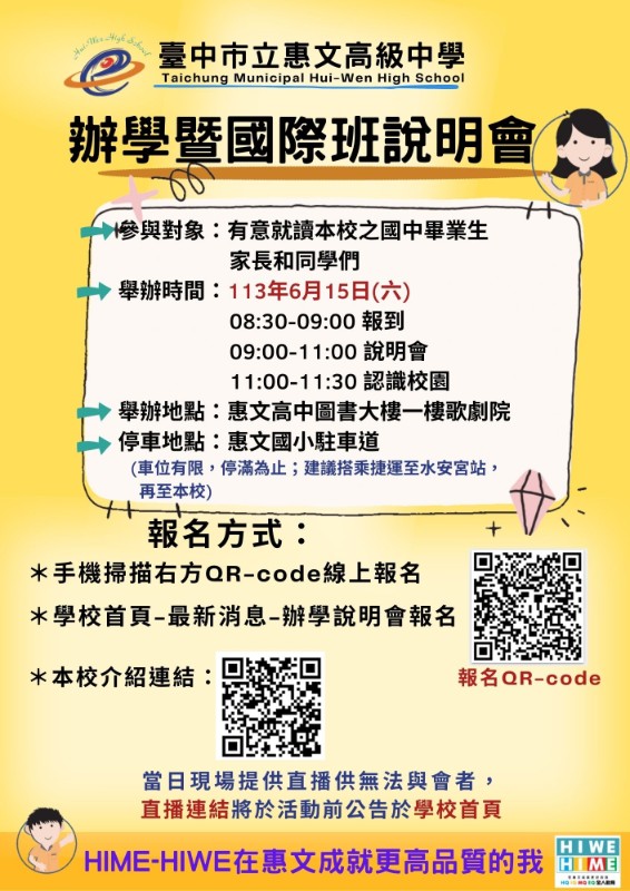 想認識惠文,可點本校介紹網站:https://sites.google.com/mail3.hwsh.tc.edu.tw/hwshfreshman/或至本校官網最新消息觀看。 |