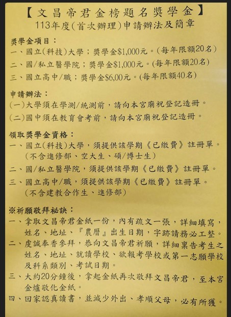 113年度北天宮文昌帝君金榜題名獎學金