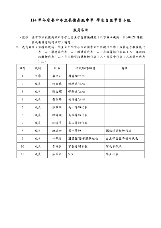 114學年度 臺中市立長億高級中學 自主學習小組名冊