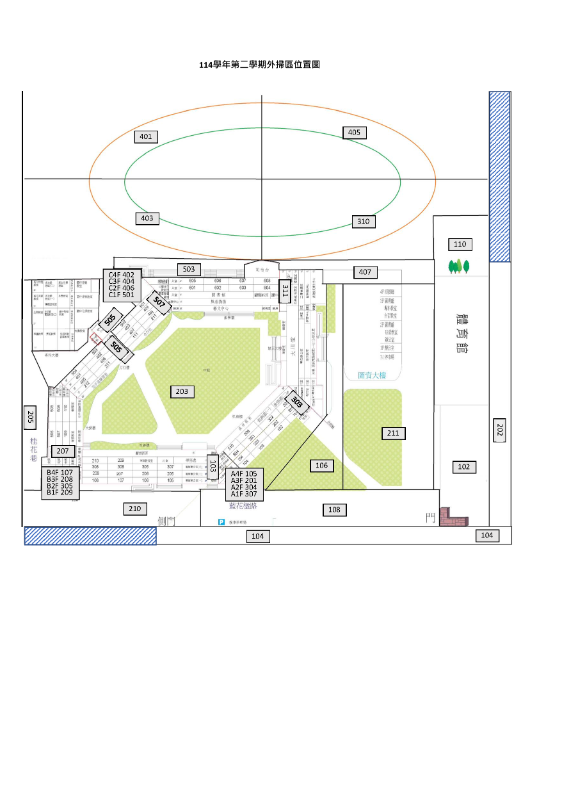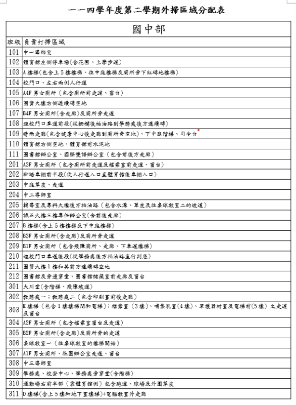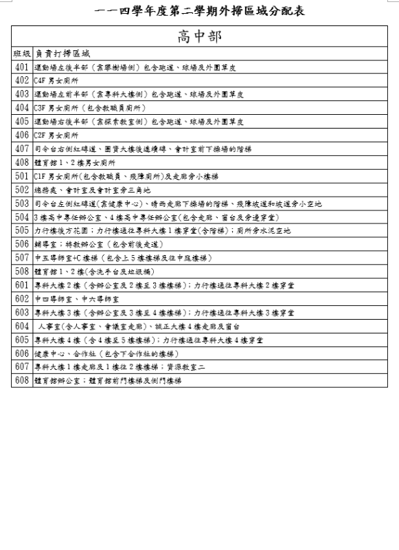 說明: 一、114學年第二學期外掃區更換日期為1/21,請各班1/21打掃新的掃區。 二、請各班先至新掃區清點留在原地的掃具後,再進行補領或更換。 三、掃具更換/補領時間: 1.補課日 1/21(三)~1/23(五):每天14:50~15:05(打掃時間) 2.第三週 2/23(一)~2/27(五):每天14:50~15:05(打掃時間) 3.第四週~學期結束:每週一14:50~15:05(打掃時間) ****更換掃具需拿舊掃具來換新,舊掃具可維修整理,請勿直接丟棄!!! 四、外掃區總表