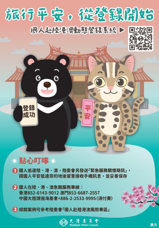 | 標題 | *人事室*【重要】檢送大陸委員會製作之「旅行平安,從登錄開始」宣導海報1份,同仁赴陸請記得登錄『國人赴陸港澳動態登錄系統』以符規定。 |