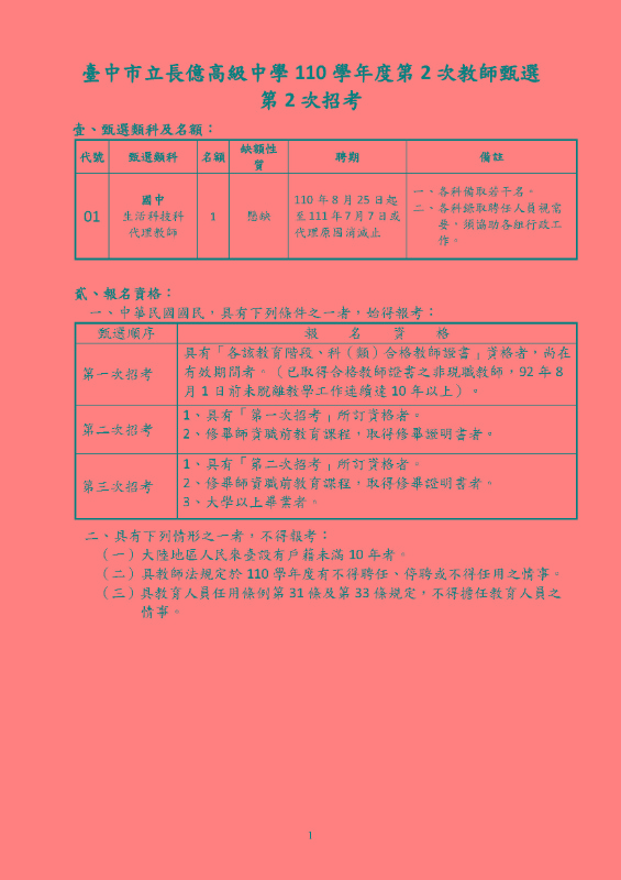 | 標題 | 本校110學年度第2次教師甄選第2次招考甄選類科及名額(代理教師) |