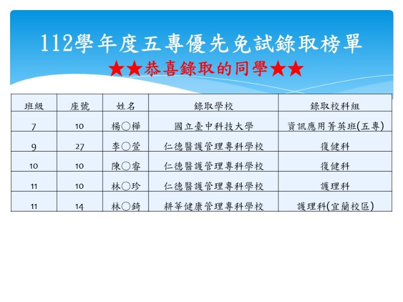 | 標題 | 【國三升學】112學年五專優先免試入學錄取名單 ★恭喜錄取同學★ |