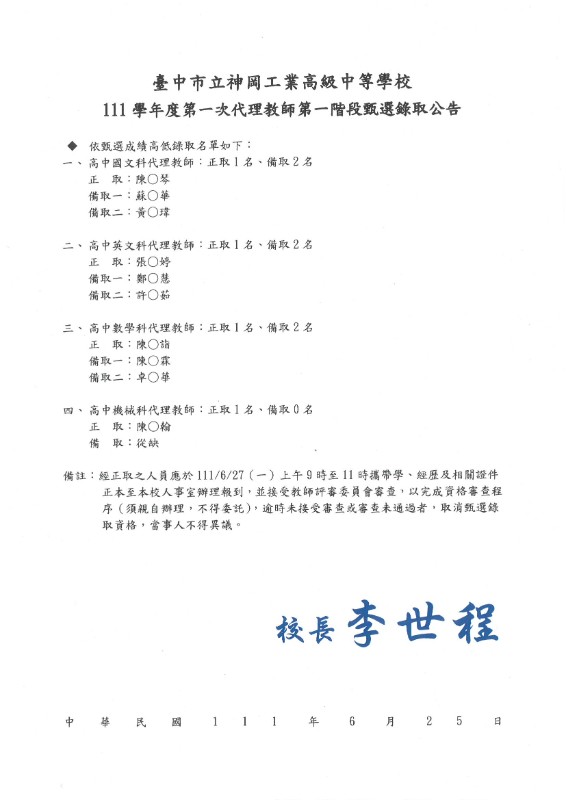 | 標題 | 臺中市立神岡工業高級中等學校 111學年度第一次第一階段代理教師甄選錄取公告暨機械科第二階段代理教師甄選簡章 |