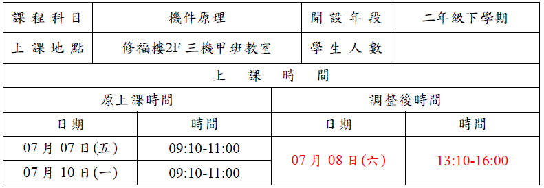 因機二丙學生周一到周五需要工廠實習,故學習扶助時間變更如下: