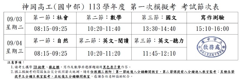 | 標題 | 【考試資訊】(國中部)國三第一次模擬考考程表_09.03(二)-09.04(三) |
