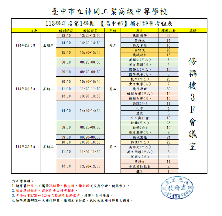 【補考訊息】(高中部)113-1補行評量公告 一、補考時間:114年2月5日(星期三) 二、補考考程表:113-1 補行評量(高中部)考程表