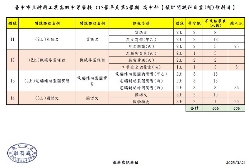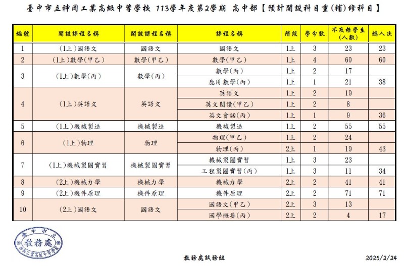 一、【預計開設科目重(補)修科目】不及格學生名單:不及格學生名單_113-2(公告校網) 二、欲重(補)修同學,請自行於成績系統加選重(補)修科目;開設科目請參閱下方說明 三、網路加選期限:114年3月5日(星期三)前。