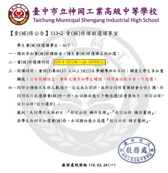 | 標題 | 【重(補)修訊息】(高中部)113-2重(補)修意願調查_網路加選至3/5(三) |