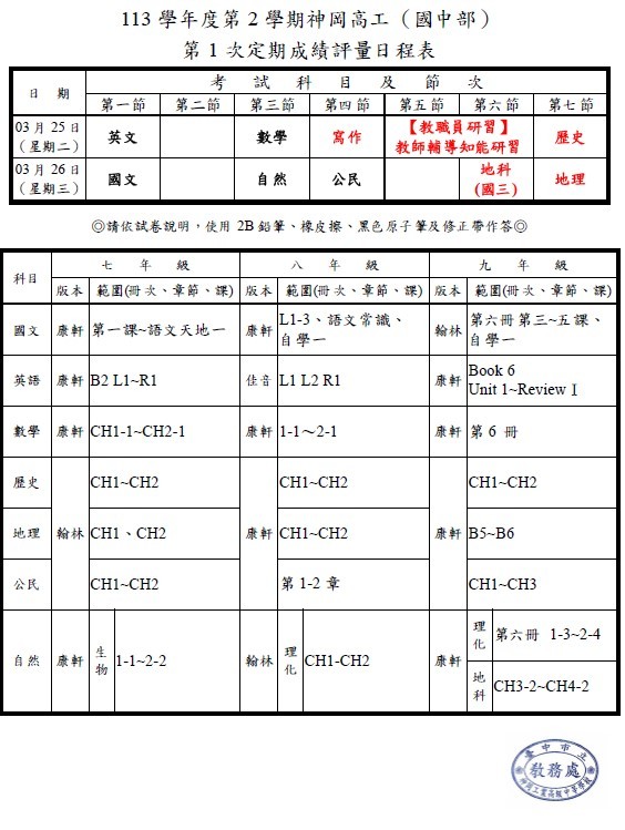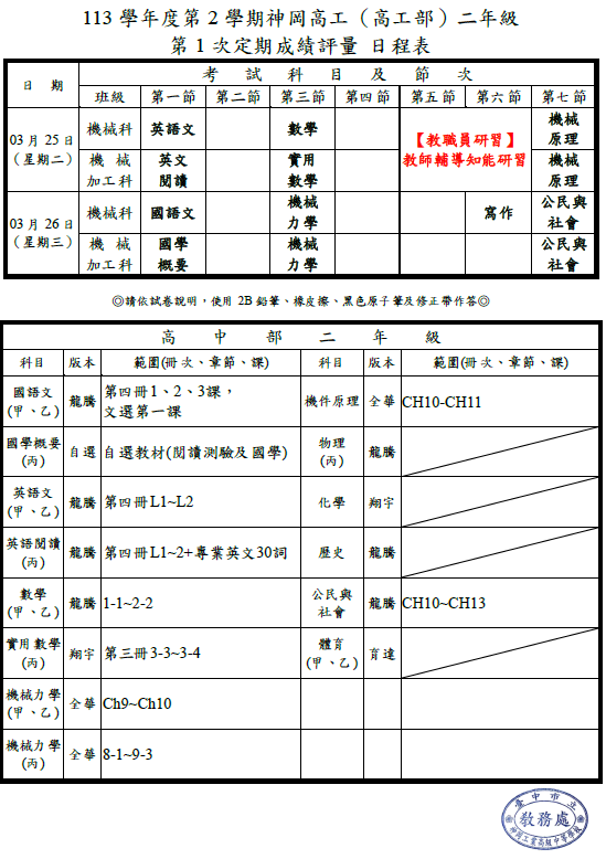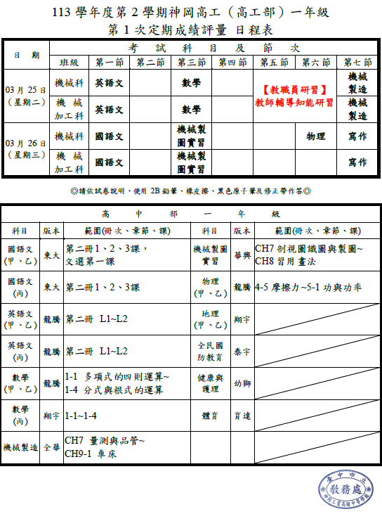 | 標題 | 【考試訊息】113-2 第一次定期評量日程表_03/25(二)-03/26(三) |