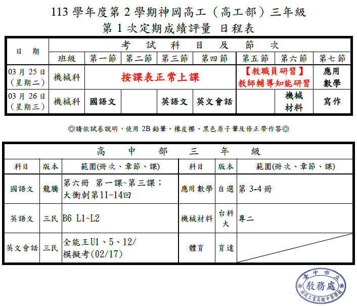 【考試訊息】113-2 第一次定期評量日程表 一、第三次定期評量日期:03/25(二)-03/26(三) 二、請學生盡早準備及複習,以爭取好成績。
