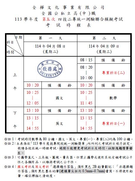 | 標題 | 【考試資訊】(高中部)高三第五次模擬考考程表_04.08(二)-04.09(三) |