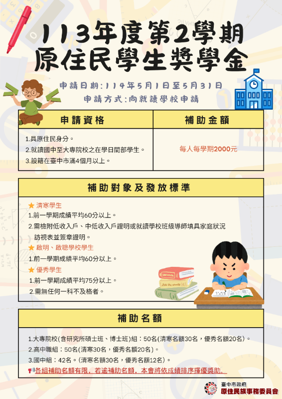 | 標題 | 【獎(助)學金】轉知「113學年度第2學期原住民學生獎學金」相關資料,請符合資格學生依限申請(申請期間自114年5月1日至114年5月31日止)(教務處截止收件日114.5.20)。 |