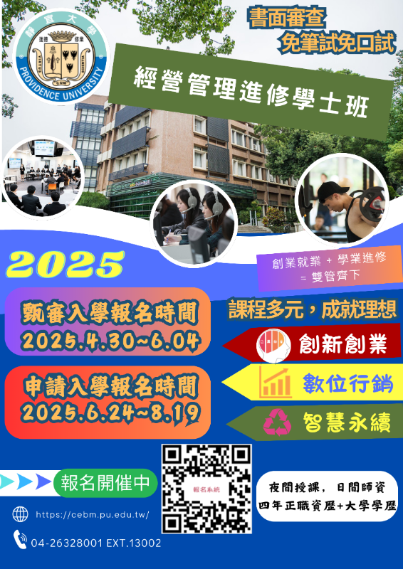 說明: 一、本校為增進高中職學生對本校招生資訊之瞭解,特提供114學年度入學招生簡章及宣傳資料,敬請貴校協助公告。 二、本校經營管理進修學士班業經教育部核定自114學年度起恢復招生,採二階段多元入學方式獨立招生。 (一) 甄審入學:書面審查、免筆試、免面試,自114年4月30日10:00起至6月4日24:00開放網路報名。 (二) 申請入學:自114年6月24日10:00起至8月19日24:00開放網路報名。 三、有關招生資訊可參閱本校進修學士班招生專區網頁,歡迎貴校師生多加參考。 四、14學年度入學招生簡章、宣傳DM及招生宣傳海報如附件,倘需紙本資料或安排招生說明會,敬請來電洽談,俾利後續安排辦理。 五、有關招生問題,請洽靜宜大學招生組,聯絡電話:(04)26328001分機11171-11175;或洽靜宜大學管理學院經營管理進修學士班,聯絡電話:(04)26328001分機13002。