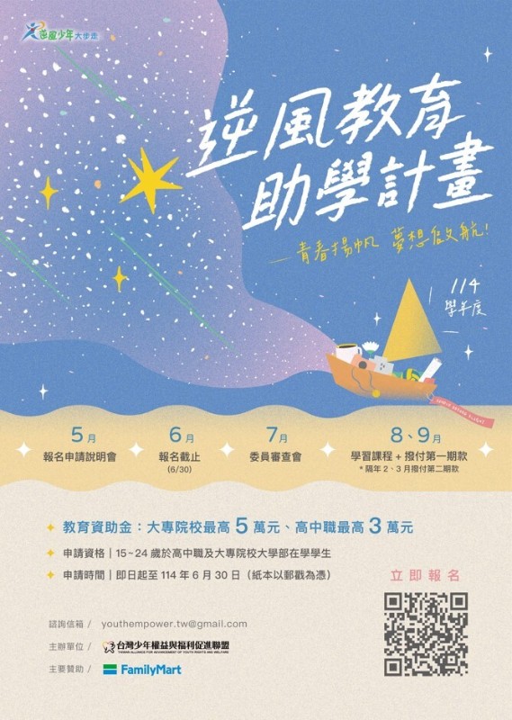 | 標題 | 【獎(助)學金】轉知社團法人台灣少年權益與福利促進聯盟辦理「114學年度逆風少年教育助學計畫」相關資料,請有需求之[高中部]學生依限申請(申請期間自114年6月30日止)。 |