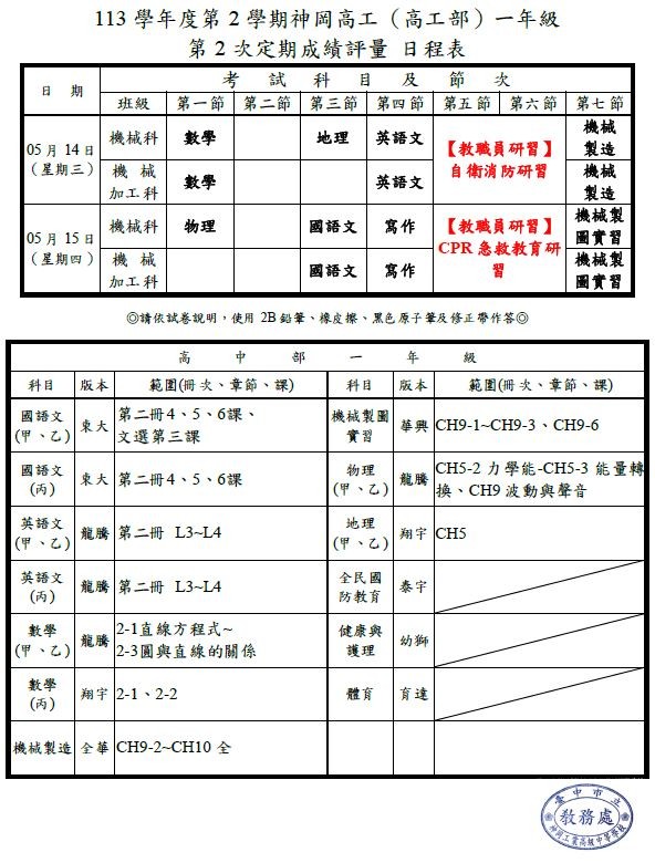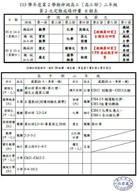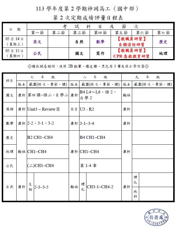 | 標題 | 【考試訊息】113-2 第二次定期評量日程表_05/14(三)-05/15(四) |