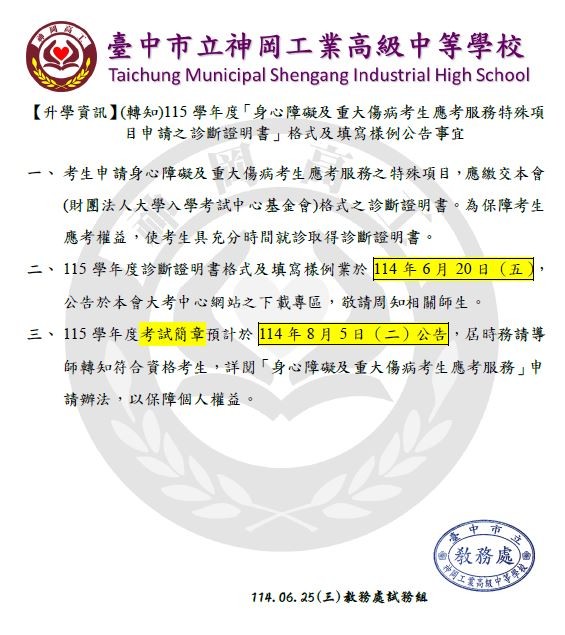 | 標題 | 【升學資訊】(轉知)115學年度「身心障礙及重大傷病考生應考服務特殊項目申請之診斷證明書」格式及填寫樣例公告事宜 |