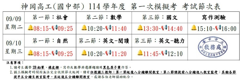 | 標題 | 【考試資訊】(國中部)國三第一次模擬考考程表_09.09(二)-09.10(三) |
