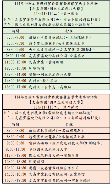 說明: 一、本校114年6月23日虎科大職涯字第1143400052號函諒達,因故變更活動日期,請詳以下說明。 二、因應本校與友嘉集團共同辦理【全國工業類科實作競賽】 已滿十週年, 特規劃辦理【114年全國工業類科實作競賽 暨產學實地參訪活動】,藉由實地參訪活動了解技職學校 及企業現況,增進選手及老師針對大專校院及產業界之認 知,鼓勵高工職參賽隊伍(含選手、老師)報名參加。 三、活動日期:114年11月11日(二)。 四、活動時間:共分為兩梯次(請詳附件-時程規劃)。 五、活動費用:活動規劃之行程內容全程免費(含遊覽車)【除 大眾交通工具、自行前往之費用需自行負擔】。 六、參與對象:高工職在學學生(工科、機械類群)、指導老師 【以將參與本年度競賽選手為優先】。 七、報名網址:https://forms.gle/Lw4iUgqqYkQDaMei8。 八、報名相關注意事項,請詳報名表單說明。 九、請惠予參與活動之相關人員公差假申請。 十、本活動若有相關疑問,請洽活動聯絡人: (一) 聯絡人:張芳瑜助理 (二) 電話:05-631-3081 (三) E-mail:ksa19382@gs.nfu.edu.tw。