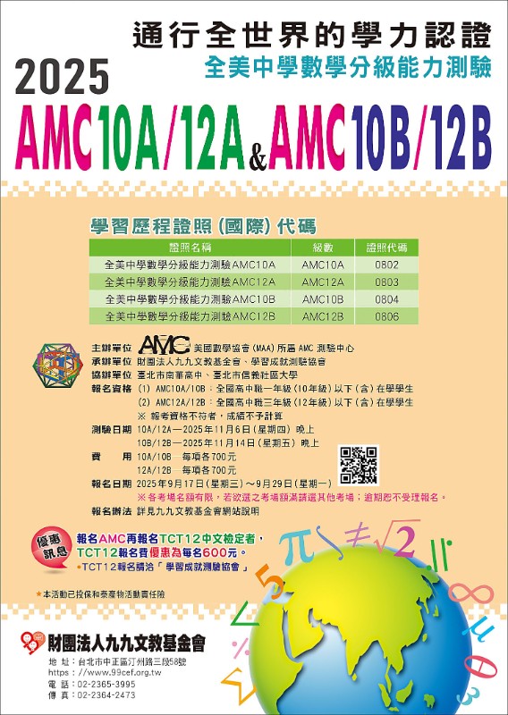說明: 一、 測驗參加對象:(一) AMC10A/10B:全國高中職一年級(10年級)以下(含)在學學生(二) AMC12A/12B:全國高中職三年級(12年級)以下(含)在學學生二、 測驗報名時間:2025年9月17日~2025年9月29日三、 測驗考試日期:(一) AMC10A/12A:2025年11月6日(星期四)晚上(二) AMC10B/12B:2025年11月14日(星期五)晚上四、 測驗報名方式:詳細報名訊息請參閱本會網站。五、 各考場名額有限,若欲選之考場額滿請選其他考場。六、 未設考區之縣市,如報名學生達一定人數以上時,請與本會聯繫,必要時得增設考區。七、請有要參加的同學於9月19日(星期五)前向教務處試務組報名。