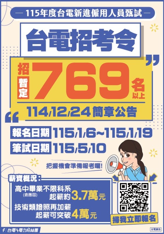 說明: 一、送本公司115年度新進僱用人員甄試簡章1份(如附件1),本甄試簡章業於114年12月24日公告,相關甄試訊息如下: (一) 報名期間:115年1月6日(09:00)至115年1月19日(24:00)止。 (二) 初(筆)試日期:115年5月10日(星期日)。 (三) 複試日期:預定115年8月4日起在臺北地區舉行,實際日期以甄試網站最新公告為準。 二、錄取人員需經1年養成培育,工作訓練期間起薪約3.7萬元;而電力技術人員如符合台電相關規定於實際從事現場技術工作或具有電力相關專業證照者,起薪更可突破4萬元;本甄試一律採網路報名,請於報名期限內至本公司新進僱用人員甄試網站完成報名,歡迎應屆畢業生及有志從事電力事業者踴躍報名。