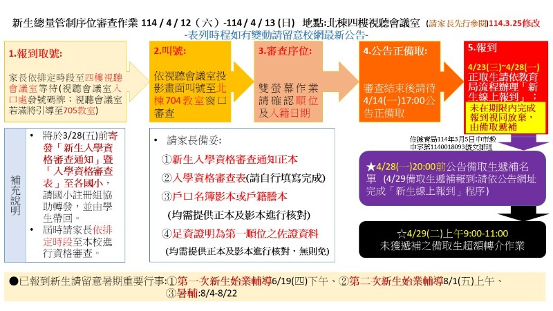 (屆時新生報到作業期程,將依本市114學年度國民中學新生入學工作期程表公告;114學年度國中一年級新生入學年齡範圍為民國101年9月2日至102年9月1日出生者)