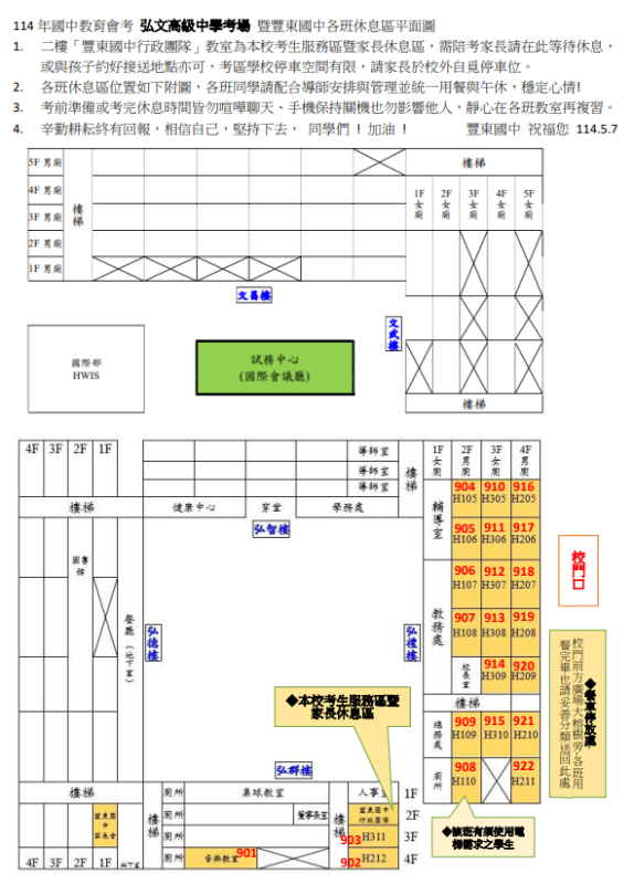 | 標題 | 114年國中教育會考 弘文高級中學考場 暨豐東國中各班休息區平面圖 | |||