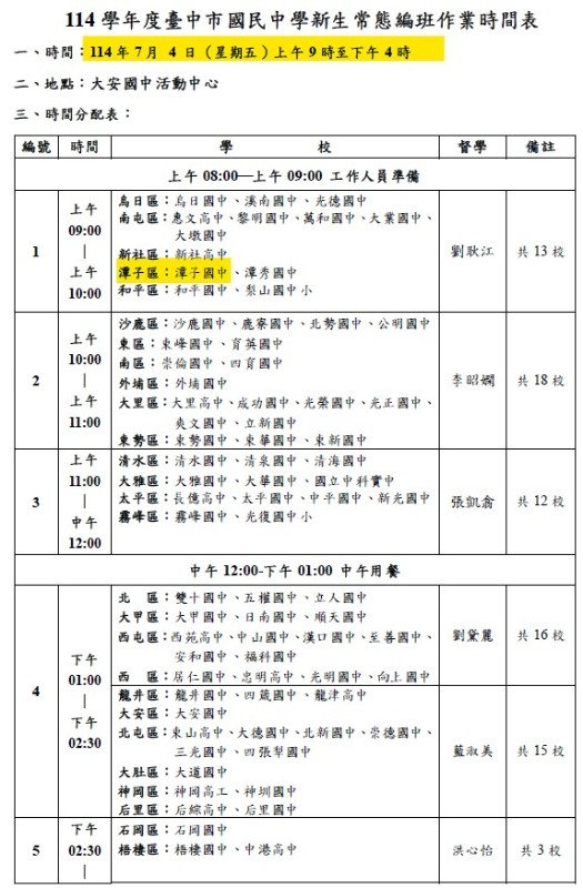 | 標題 | 114學年度臺中市國民中學常態編班電腦作業訂於114年7月4日(星期五) |