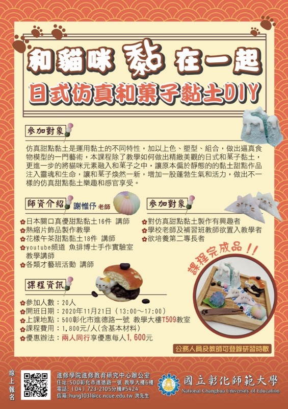 轉知:國立彰化師範大學進修學院推廣教育「和貓咪<黏>在一起-日式仿真和菓子黏土DIY」非學分班招生訊息