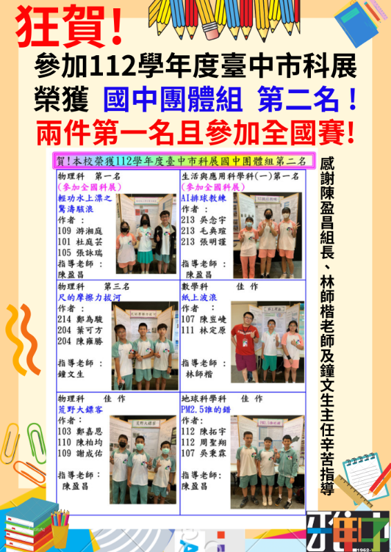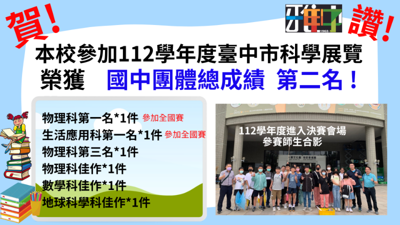 | 標題 | 恭喜 ! 本校奪得112學年度臺中市科展比賽國中團體組第二名的佳績 ! |