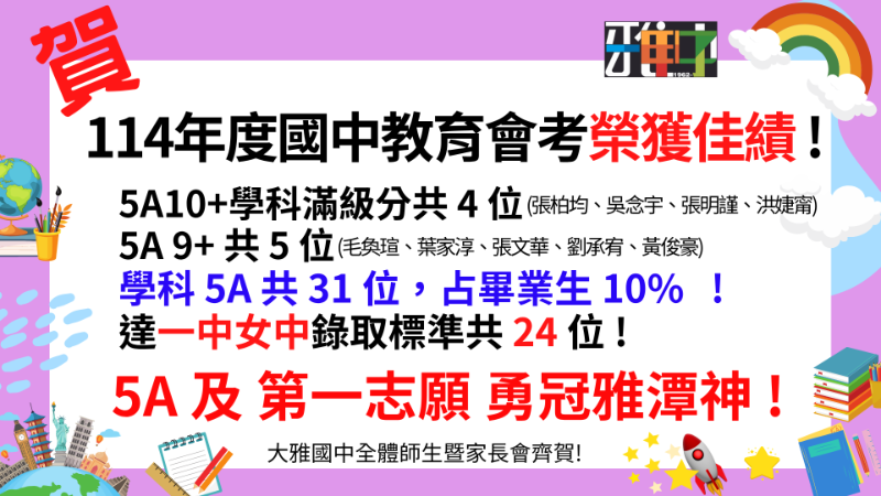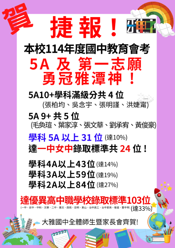 | 標題 | 狂賀 ! 本校114年度國中教育會考再創佳績 ! 共31位同學考取5A,4位學科滿級分5A10+,達一中女中錄取標準共24位 ! |